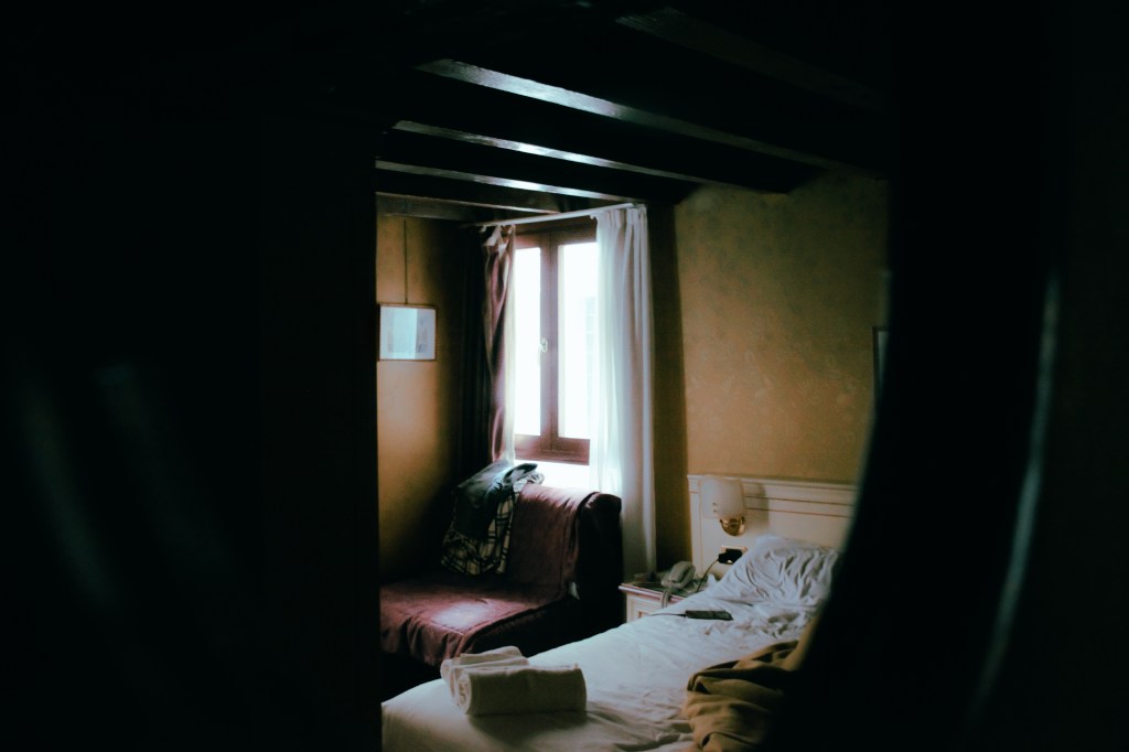 In a quiet Venetian room, light filters gently through draped curtains, painting the worn textures of a lived-in space. In this small corner of the world, time slows down, offering not silence but serenity.